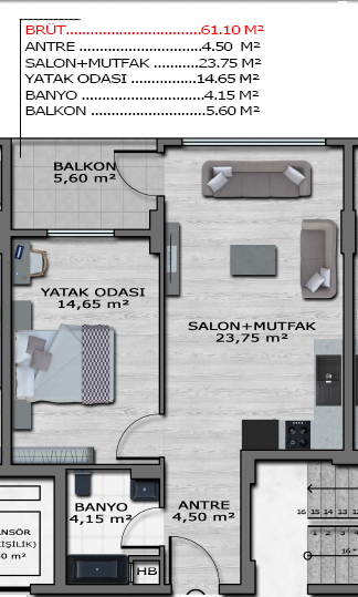 Brüt 63 m², net 56 m² olan 1+1 dairemiz şu şekilde planlanmıştır: