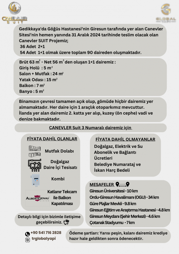Açıklamalar ve ÖzellikleriGedikkaya'da, Göğüs Hastanesi'nin Giresun tarafında, Canevler Sitesi'nin hemen yanında yer alan Canevler Suit projemiz, 31.05.2025 tarihinde teslim edilecektir.