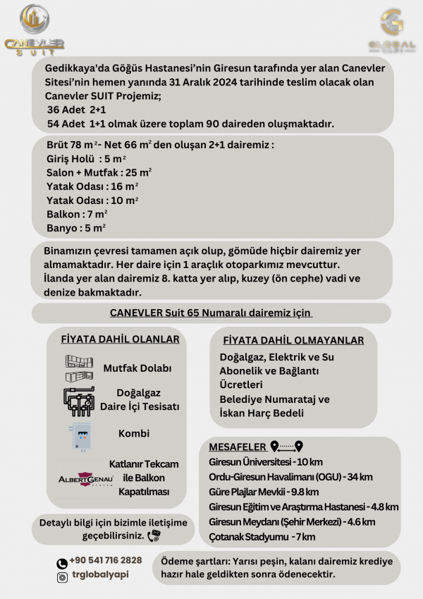 Açıklamalar ve ÖzellikleriGedikkaya'da, Göğüs Hastanesi'nin Giresun tarafında, Canevler Sitesi'nin hemen yanında yer alan Canevler Suit projemiz, 31.05.2025 tarihinde teslim edilecektir. Projemiz, 36 adet 2+1 ve 54 adet 1+1 olmak üzere toplamda 90 daireden oluşmaktadır. Brüt 78 m², net 66 m² olan 2+1 dairemiz şu şekilde planlanmıştır: