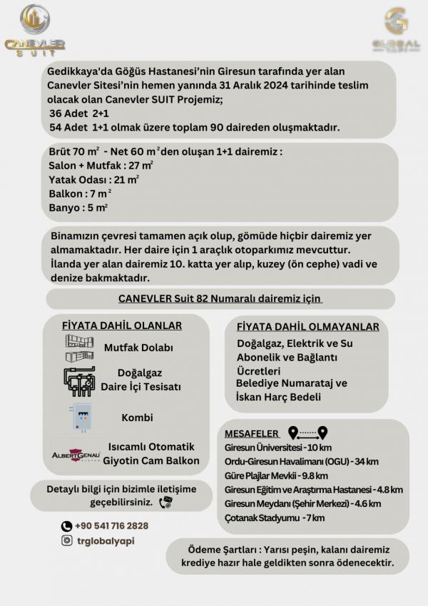 Açıklamalar ve ÖzellikleriGedikkaya'da, Göğüs Hastanesi'nin Giresun tarafında, Canevler Sitesi'nin hemen yanında yer alan Canevler Suit projemiz, 31.05.2025 tarihinde teslim edilecektir.