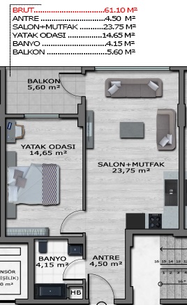 Brüt 63 m², net 56 m² olan 1+1 dairemiz şu şekilde planlanmıştır: