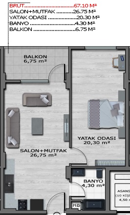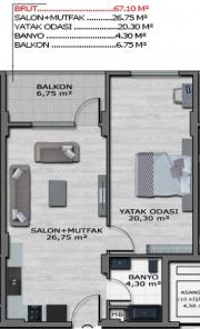 Brüt 70 m², net 60 m² olan 1+1 dairemiz şu şekilde planlanmıştır: