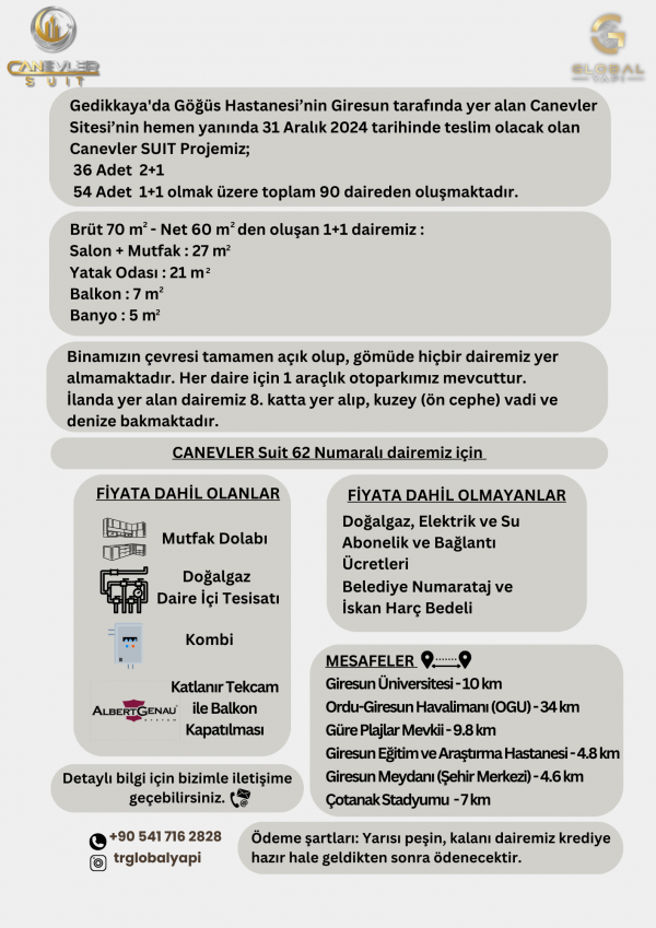 Açıklamalar ve ÖzellikleriGedikkaya'da, Göğüs Hastanesi'nin Giresun tarafında, Canevler Sitesi'nin hemen yanında yer alan Canevler Suit projemiz, 31.05.2025 tarihinde teslim edilecektir.