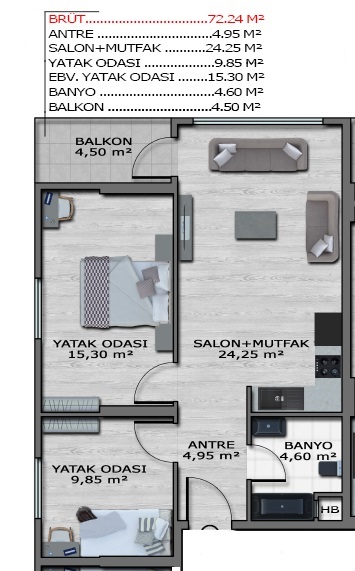 Brüt 78 m², net 66 m² olan 2+1 dairemiz şu şekilde planlanmıştır: